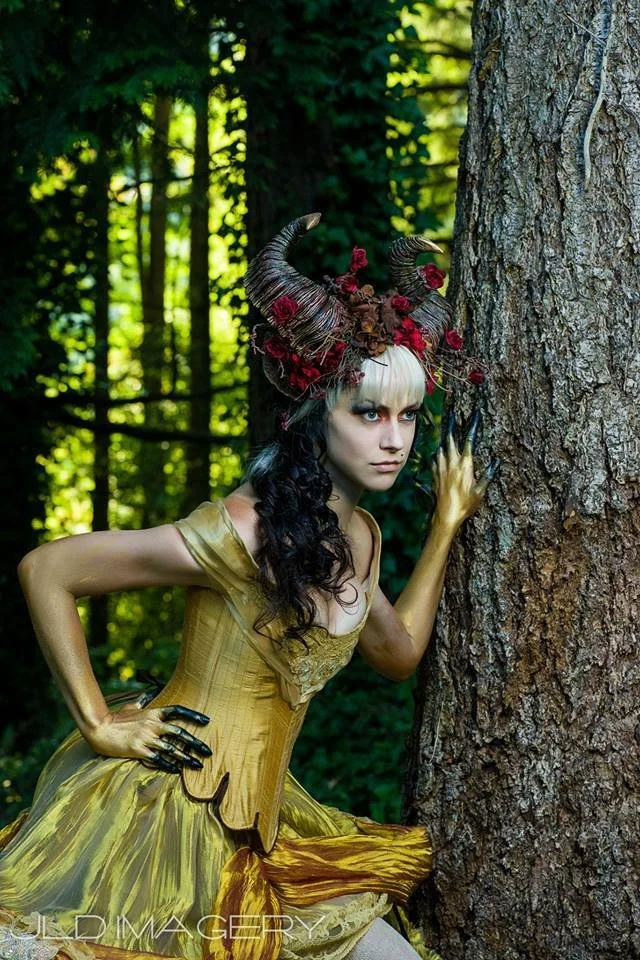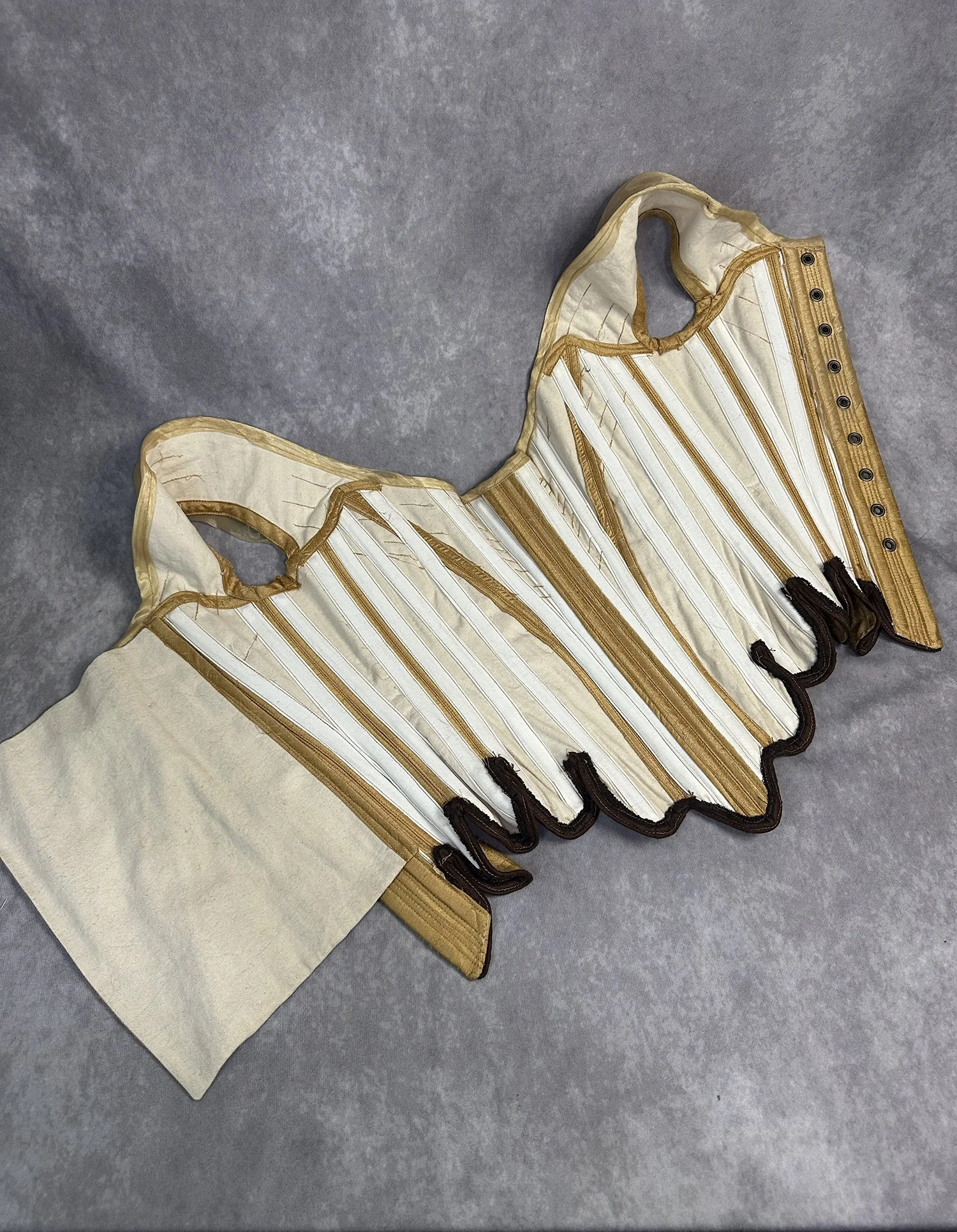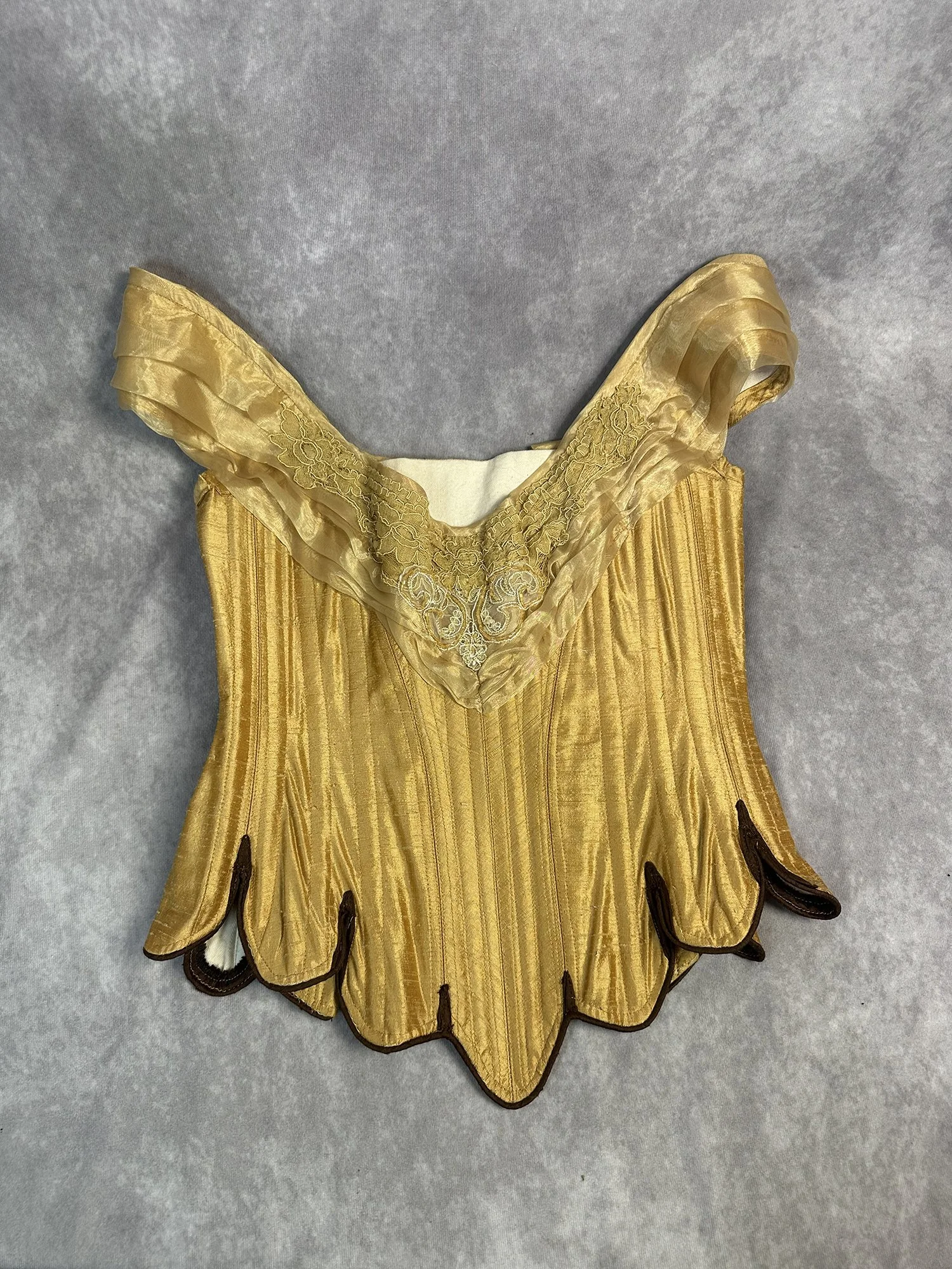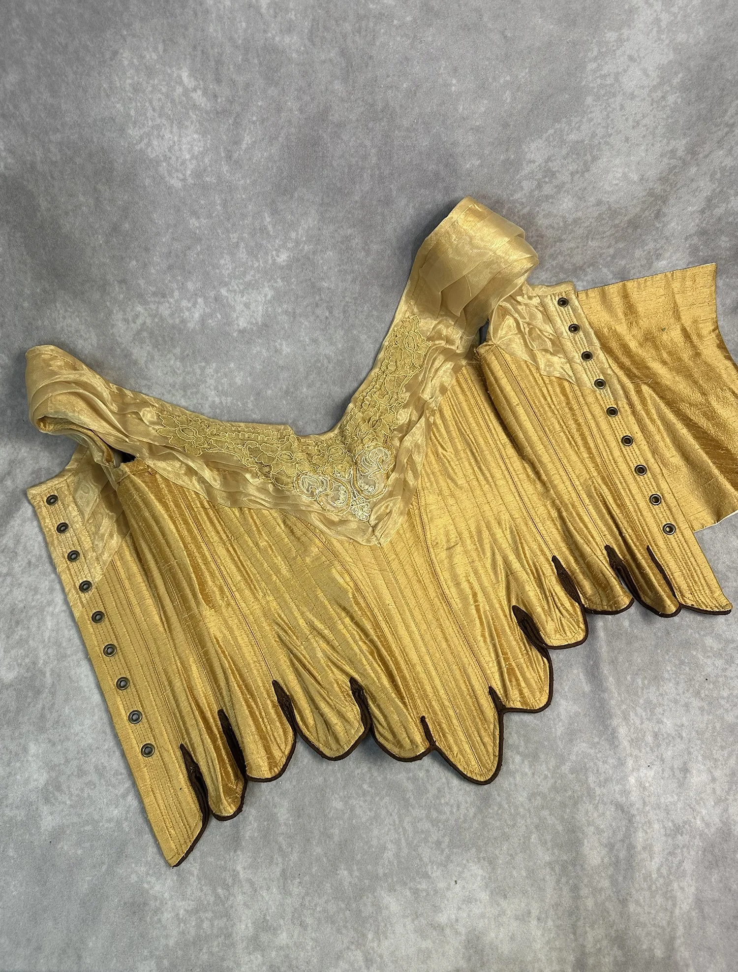 Belle Beast Silk Tabbed Corset- Perfect condition inside and out. Spiral steel bones throughout. 100% silk dupioni fully lined in cotton coutil with tape finished seams. Embroidery & appliques all applied by hand. Reinforced kick press set grommets. Waist measures 22” boning edge to boning edge. (Modesty panel included as pictured). Arm hole measures 13”.